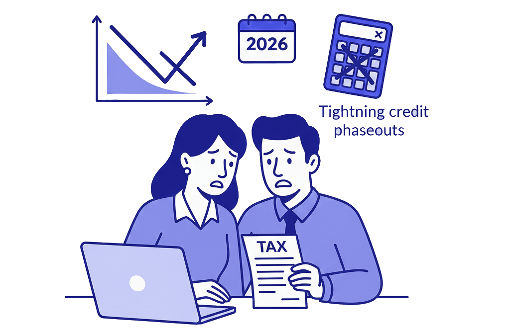 In 2026, married couples filing jointly will reach higher brackets faster, and credit phaseouts occur sooner.