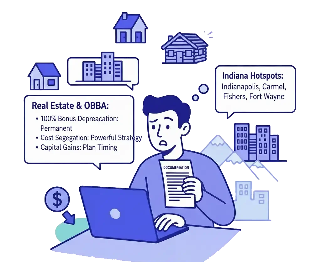 For property owners in hot markets like Indianapolis, Carmel, Fishers, and Fort Wayne, OBBBA brings welcome news. The 100% bonus depreciation for qualified property is now permanent. This allows real estate investors to immediately write off the cost of certain assets on their federal return, making strategies like cost segregation incredibly powerful. With Indiana’s real estate market poised for continued growth, timing property sales and managing capital gains exposure remains a critical planning point.