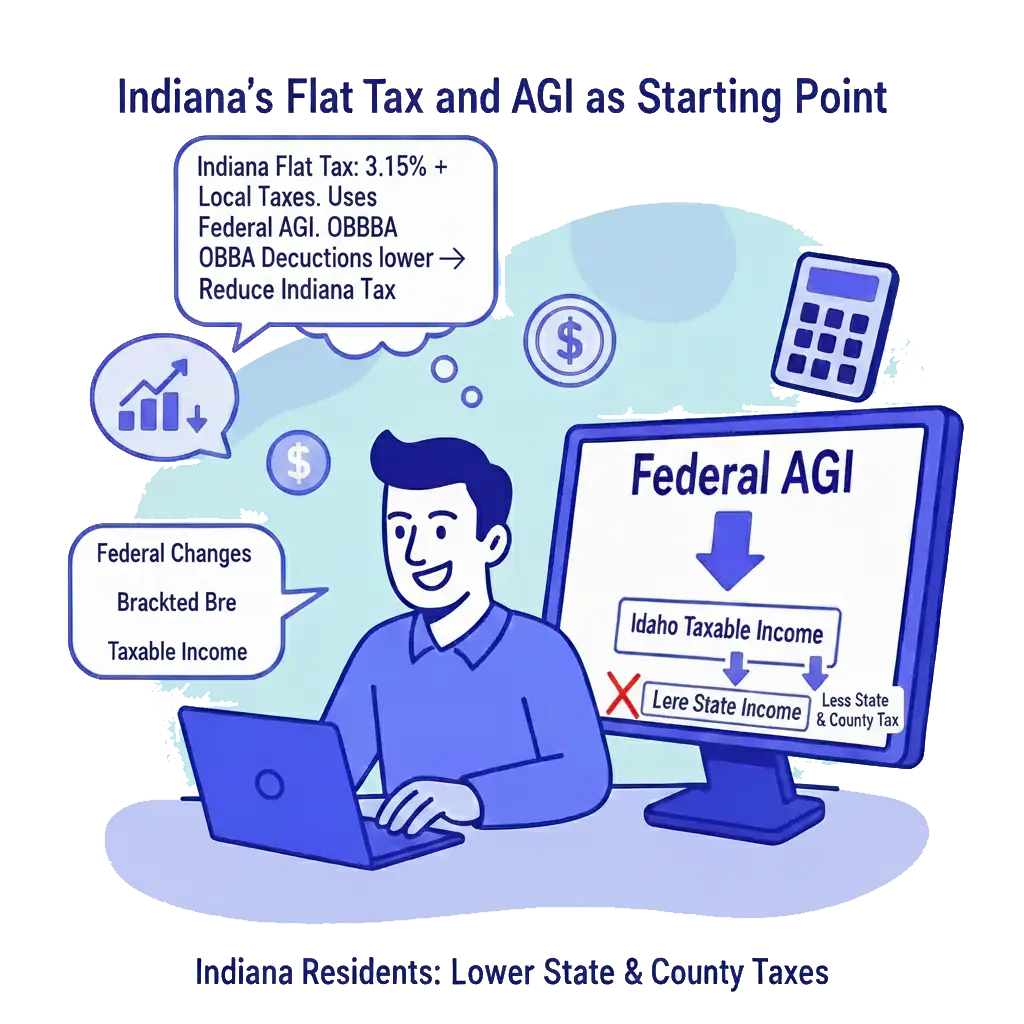 Indiana has a competitive flat state income tax of 3.15%, plus local county taxes. Because Indiana uses federal Adjusted Gross Income (AGI) as the starting point for state taxes, the permanent federal deductions under OBBBA help keep your AGI lower, which in turn can reduce your state and county tax liability. While the state tax rate remains the same, a lower starting income figure is a clear benefit.