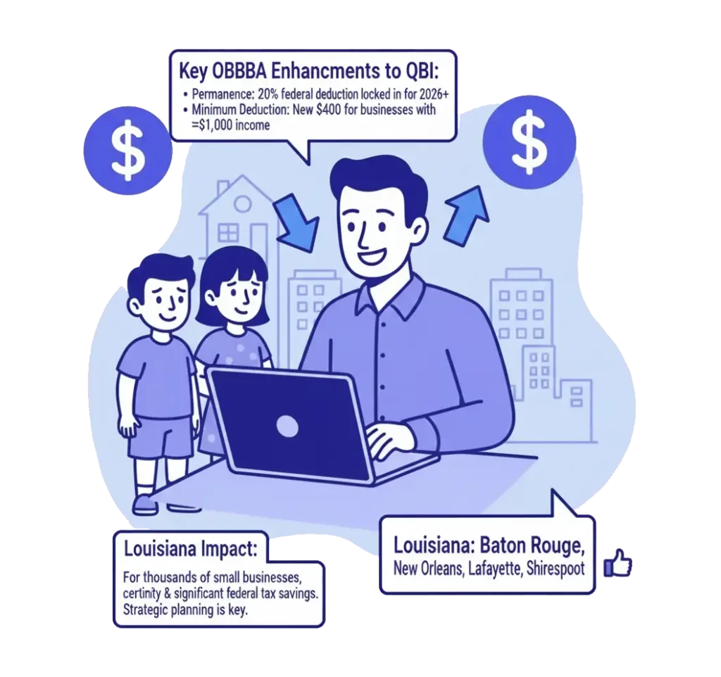 👉 Louisiana Impact: For the thousands of small businesses that are the backbone of Louisiana’s economy, the permanent federal QBI deduction provides certainty and significant federal tax savings. Strategic planning to maximize this federal benefit is more important than ever.
