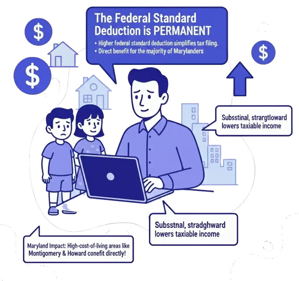 A permanent, higher federal standard deduction is a direct benefit for the majority of Marylanders, especially in high-cost-of-living areas like Montgomery and Howard counties. It provides a substantial, straightforward deduction on your federal return, lowering your taxable income without the need for complex itemization.