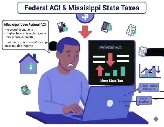 Mississippi has a state income tax system that begins with federal AGI, so federal changes will directly increase state taxable income for many residents.