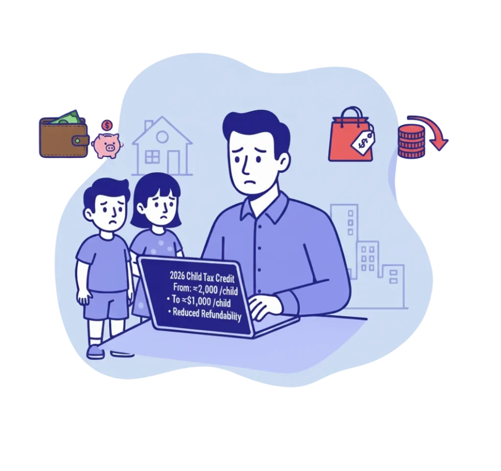 Higher brackets, reduced deductions, credit changes, and the expiration of TCJA force both federal and state liabilities higher.