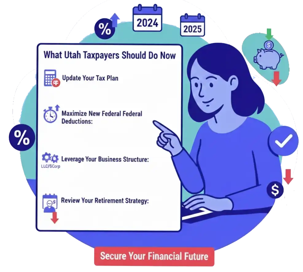 - Update Your Tax Plan: Your old strategy is obsolete. It’s time to build a new plan based on the dual benefits of permanent federal cuts and Utah's lower state tax rate.