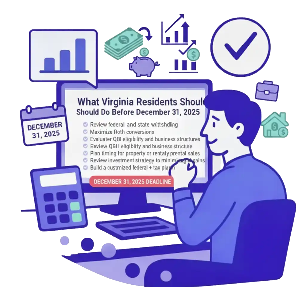 - Build a comprehensive federal + Virginia tax strategy for 2025–2026