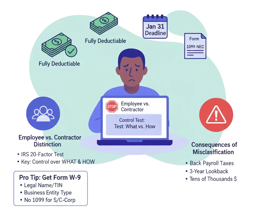If you misclassify an employee as a contractor, the consequences can be devastating. You could be liable for back payroll taxes (both the employee’s and the employer’s share), penalties for failure to pay, and interest. The IRS can go back three years, and the total bill can easily run into the tens of thousands of dollars.
