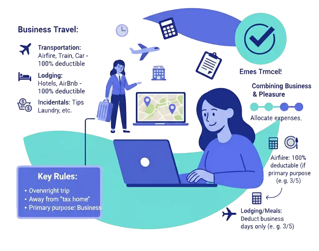 The cost of travel for business purposes is deductible, but the travel must be overnight and away from your “tax home” (the city or general area where your main place of business is located). The primary purpose of the trip must be for business.