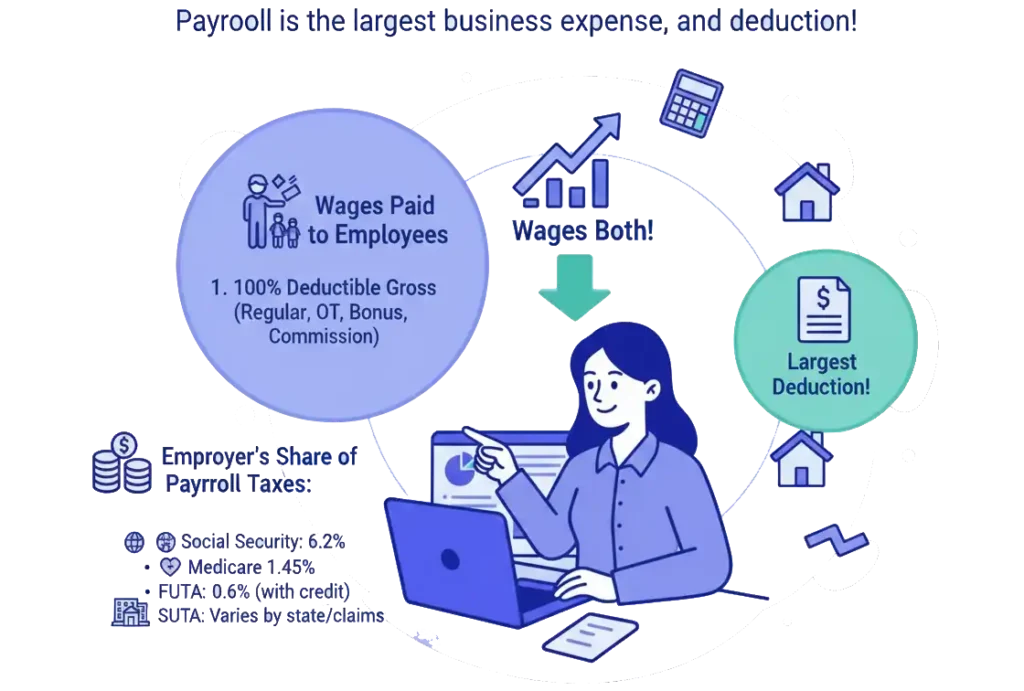 The gross amount of salaries and wages you pay to your employees is 100% deductible. This includes regular wages, overtime pay, bonuses, and commissions. In addition to the wages themselves, you can also deduct the employer’s share of payroll taxes. This includes: