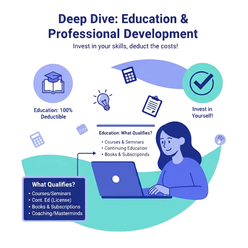 👉Pro Tip: Think broadly about this deduction. It’s not just about formal courses. It can also include things like attending industry conferences, hiring a consultant to teach you a new skill, or even traveling to meet with a mentor. As long as you can show a clear connection to improving your skills in your current business, it is likely deductible.