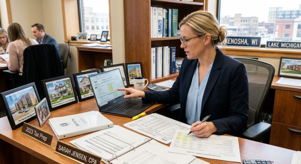 Client Profile: Sarah, a Kenosha real estate investor with two single-family rental homes and a duplex complex (total value $850,000). Annual rental income: $65,000. Mortgage balances: $420,000 combined.