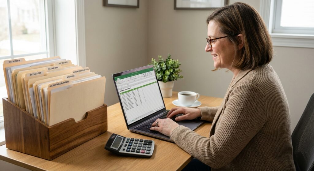 - Calculate Your Potential Savings: Using the examples in this guide, estimate home office deduction (actual method vs. simplified), annual mileage deduction, typical meal expenses, and equipment purchases. A rough calculation often reveals $200-$400 monthly in potentially deductible expenses you weren’t claiming.