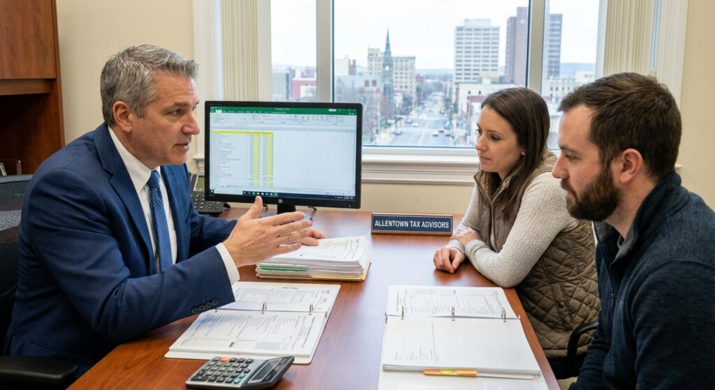 The Situation: Maria owns three rental duplexes in Allentown totaling $180,000 annual gross rental income. She hired a bookkeeper who reported all rent but missed deducting $35,000 in legitimate expenses: mortgage interest, repairs, and property management fees. Her previous tax preparer didn’t optimize her tax structure.