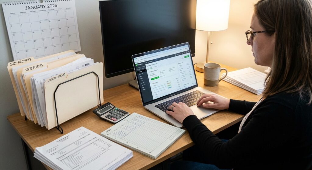 - Audit your 2025 income. Gather all 1099-NEC and 1099-K forms from clients and payment processors. List every income source with amounts received and any fees or refunds.
