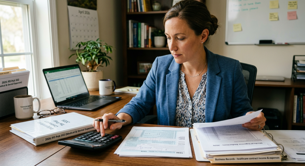 Schedule C (Profit or Loss from Business) is the core filing document for medical contractor income reporting. This form captures your gross revenue from all clients, reduces it by legitimate business expenses, and produces the net profit figure used throughout your tax return. For 2026, proper Schedule C completion is critical because errors trigger audits and penalties. Medical contractors must maintain detailed records to support every expense claimed.