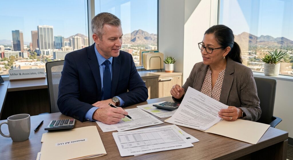 For Arizona landlords with rental income exceeding $50,000 annually, evaluating S Corp election becomes critical. An S Corp allows you to pay yourself a “reasonable salary” subject to payroll taxes, with excess profit distributed as non-taxable distributions. If you generate $120,000 annual rental profit, you might pay yourself $60,000 W-2 wages (triggering 15.3% self-employment tax, or roughly $9,180) and take $60,000 distributions (zero self-employment tax). This saves $9,180 compared to sole proprietorship structure. For a real estate investor with multiple properties, these savings compound annually.